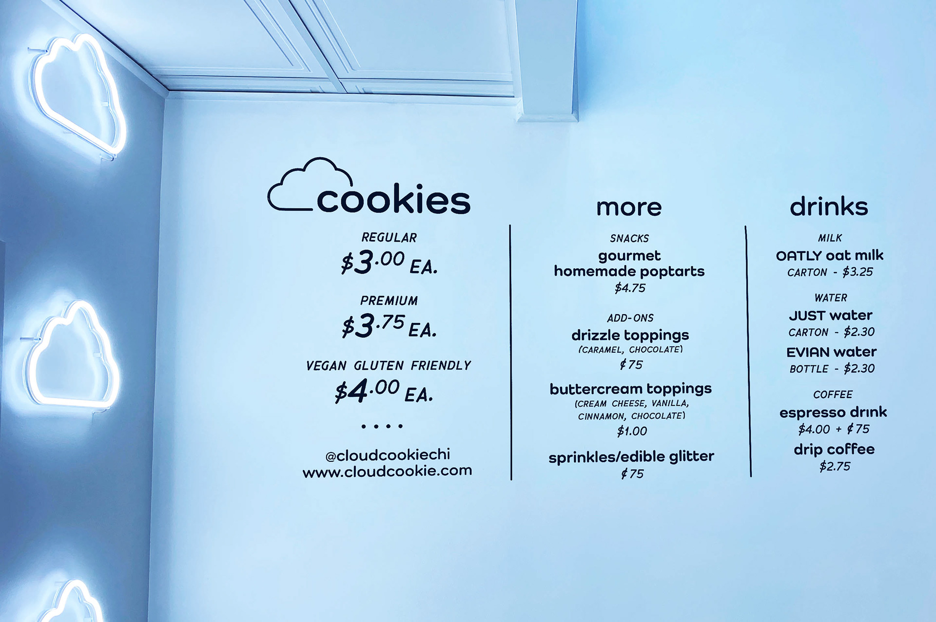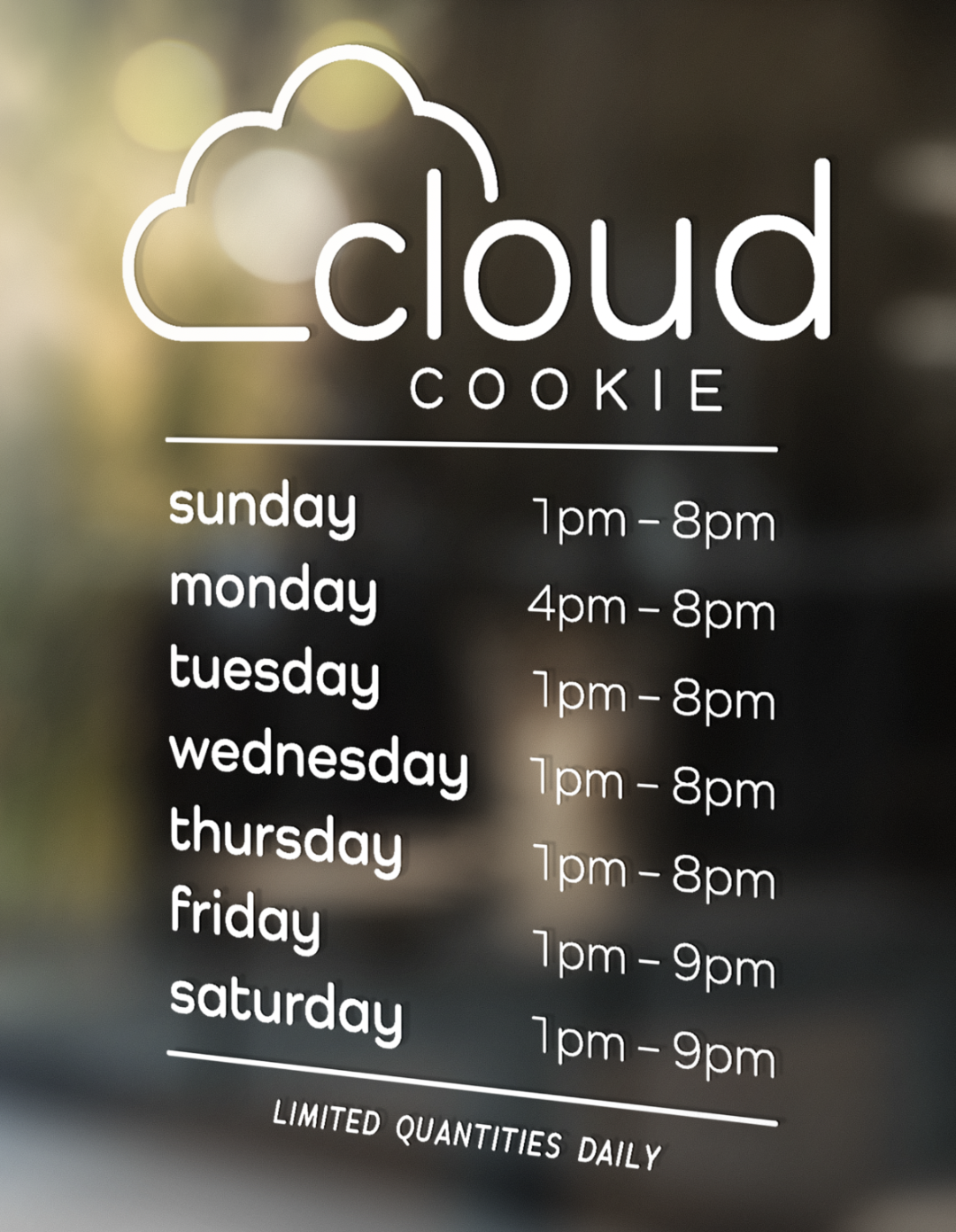 Developed the full branding and visual identity for Cloud Cookie, including menus, merchandise, vinyl signage, and cookie boxes, creating a cohesive, playful experience across all touchpoints.