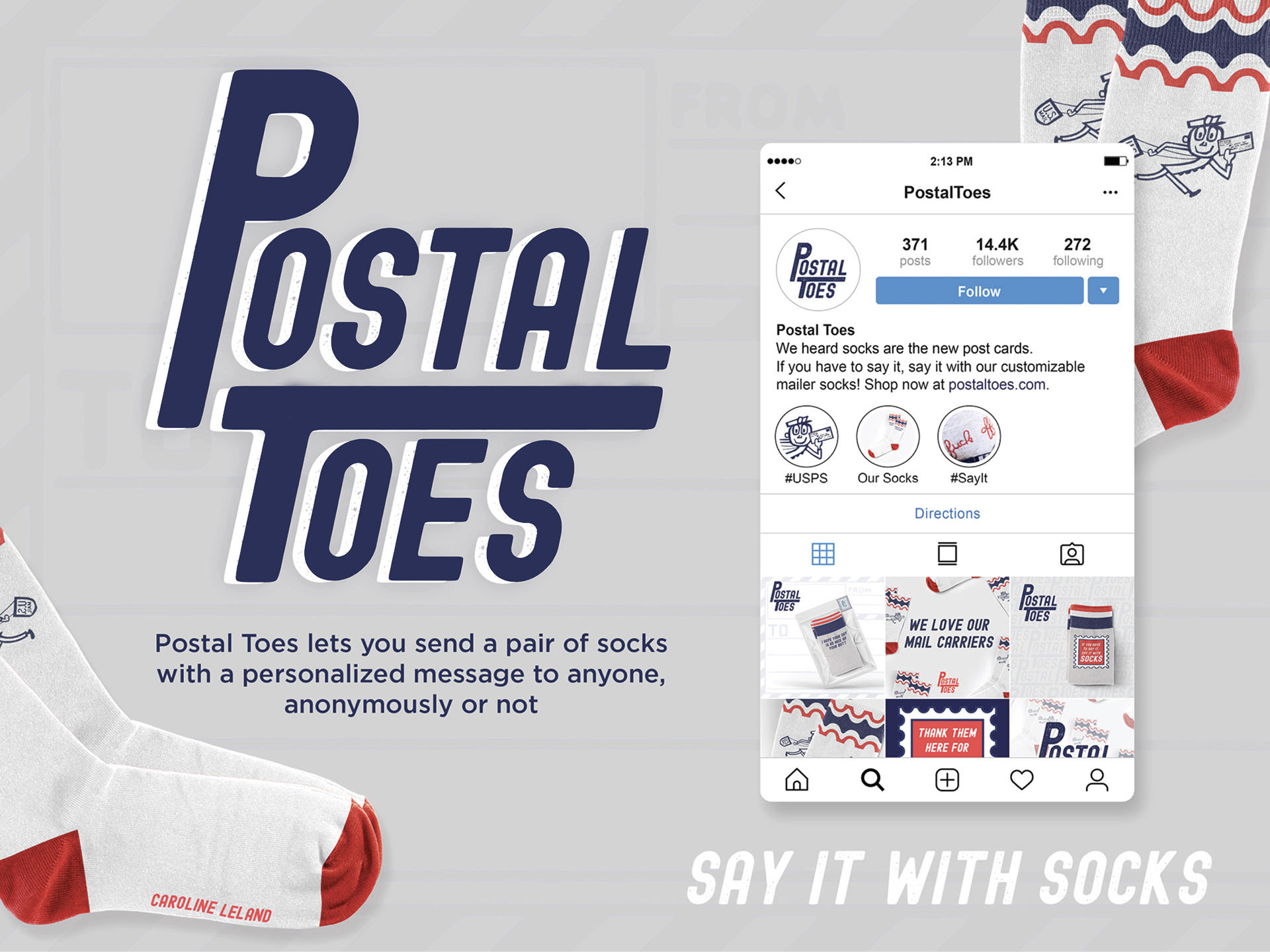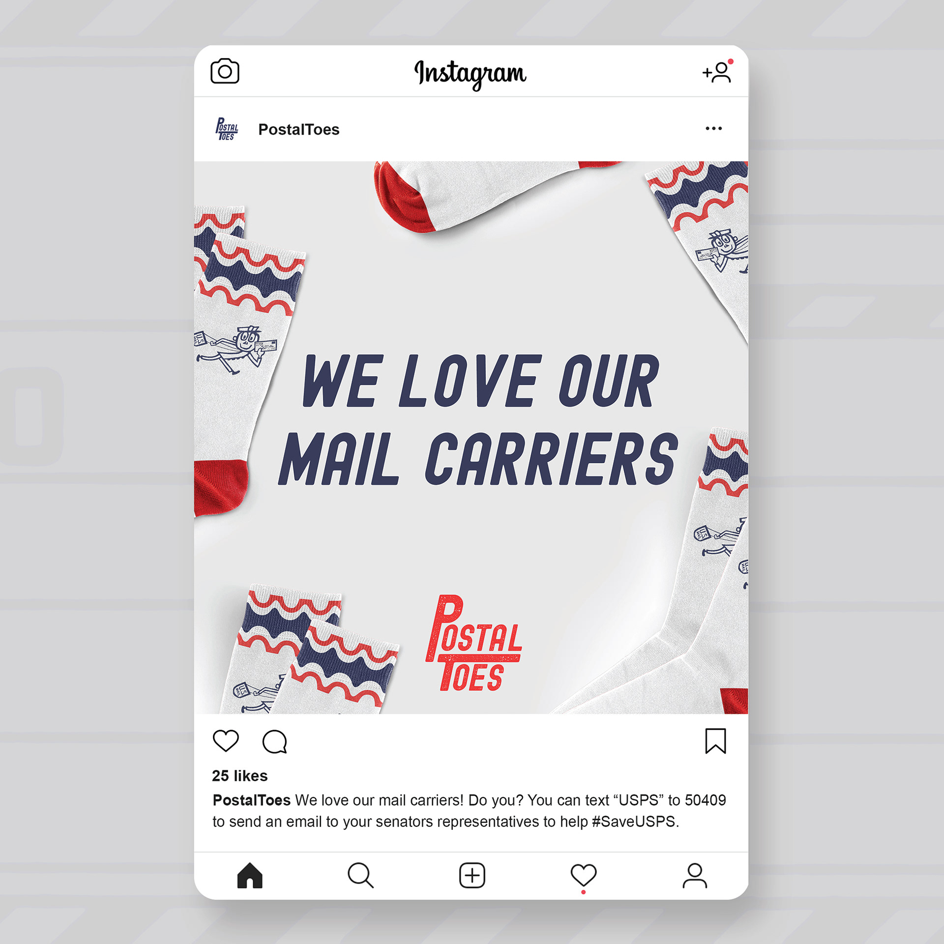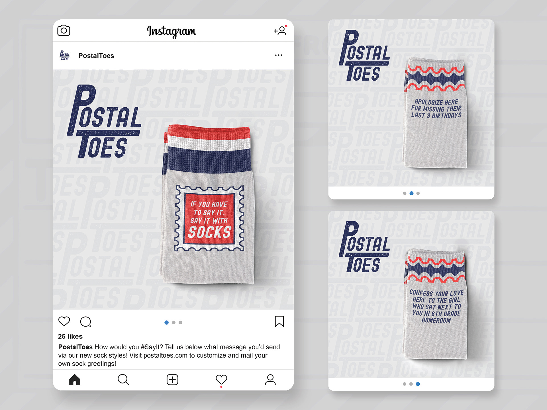 Postal Toes is a conceptual sock brand I created from scratch. I developed the full branding, including logo, patterns, packaging, and social media assets, to appeal to young, playful, design-conscious consumers. The whimsical, mail-inspired identity uses bright colors and illustration to give the brand personality and make it memorable.